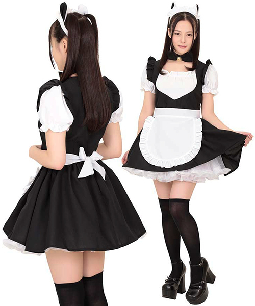 商品番号:b16356 カラー:ブラック 種類:コスチューム/KH0013BK 仕様:適応サイズ:B78〜88cm・W58〜70cm・H87〜95cm 着丈:73cm セット内容:ワンピース・エプロン・カチューシャ・チョーカー
