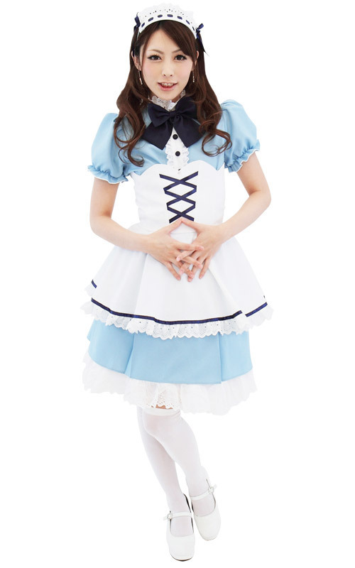 商品番号:b19928 カラー:サックス 種類:コスチューム/KH0020SX 仕様:適応サイズ:B78〜88cm・W58〜70cm・H87〜95cm セット内容:ワンピース・コルセット・エプロン・パニエ・カチューシャ・リボン