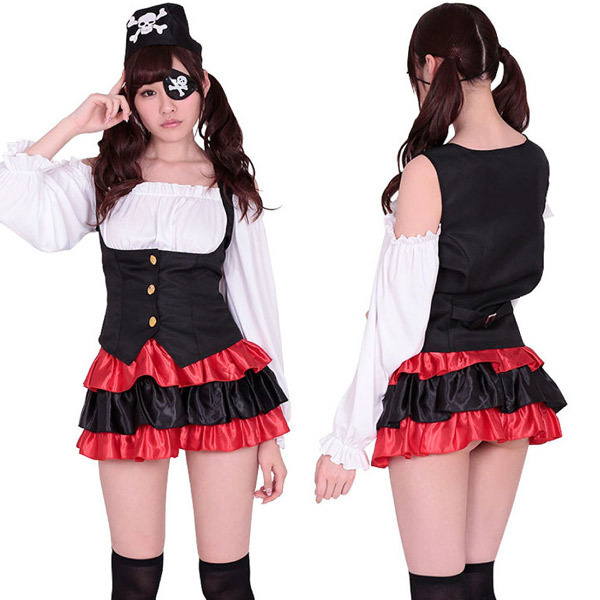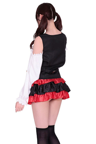 商品番号:b25884 カラー:ブラック 種類:コスチューム/A0654BK 仕様:Mサイズ:B78〜88cm・W58〜70cm・H87〜95cm セット内容:ブラウス付ベスト、フリルスカート、眼帯、スカーフ帽