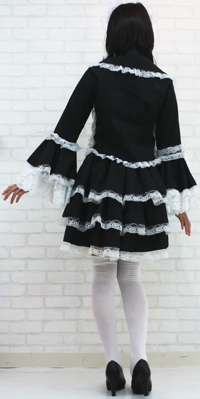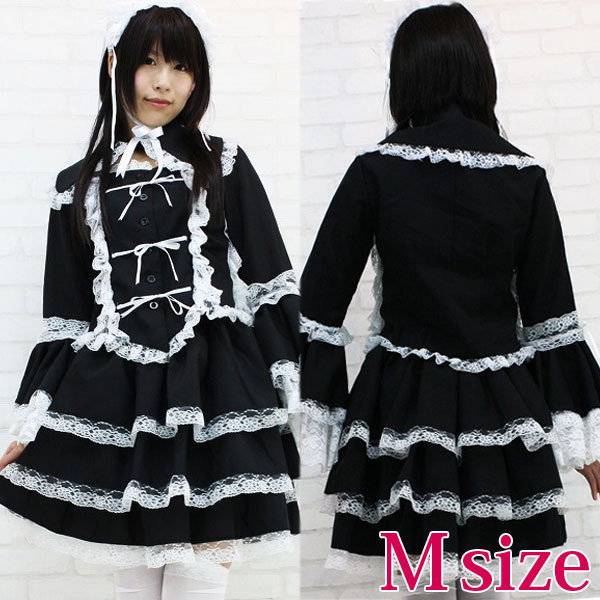 商品番号:cm0014 カラー:ブラック 種類:コスチューム/NH1002M 仕様:Mサイズ:B76〜82cm・W64〜100ccm 丈:上着48cm(袖62cm・肩幅37cm)・スカート47cm セット内容:ジャケット(前ボタン留め、姫袖)・別衿・ヘッドドレス(総レース仕様、バラのコサージュ付き)・スカート(ウェストゴム入り)