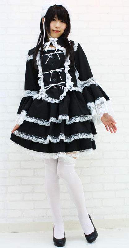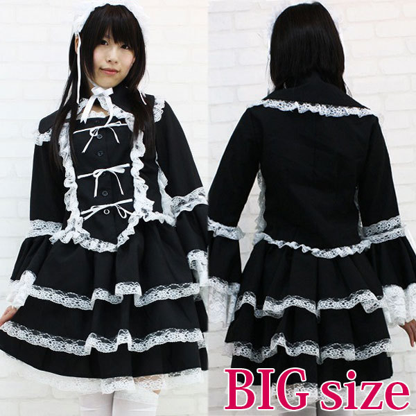 商品番号:cm0016 カラー:ブラック 種類:コスチューム/NH1002B 仕様:BIGサイズ:B85〜90cm・W90〜116cm 丈:上着53cm(袖65cm・肩幅39cm)・スカート48cm セット内容:ジャケット(前ボタン留め、姫袖)・別衿・ヘッドドレス(総レース仕様、バラのコサージュ付き)・スカート(ウェストゴム入り)