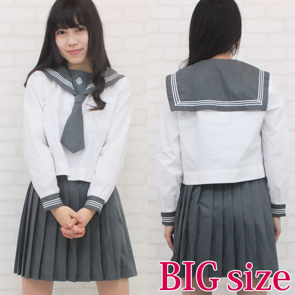 商品番号:cm0136 カラー:-- 種類:コスチューム/NK3013B 仕様:BIGサイズ:B114cm程度・W〜86cm 丈:上着53cm(袖丈60cm)・肩幅45cm・スカート48cm セット内容:上着(横ファスナー、袖・襟に3本ライン入り(白色)、胸当てに校章入り(白色)、胸ポケット付き)・スカート(横ファスナー、アジャスター有り)・スカーフ
