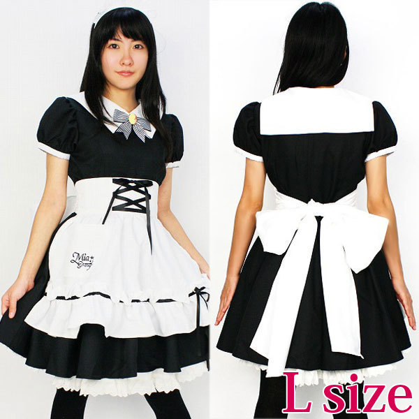 商品番号:cm0146 カラー:-- 種類:コスチューム/NH1005L 仕様:Lサイズ:B87〜98cm・W70〜77cm 丈:ワンピース80cm(袖丈17cm)・ペチコート50cm セット内容:ワンピース(後ろファスナー、袖パフスリーブ、全円スカート、内側に襟固定用のボタン付)・エプロン・ペチコート(裾レース付、ウェストゴム仕様)・カチューシャ・ブローチ(安全ピン付)