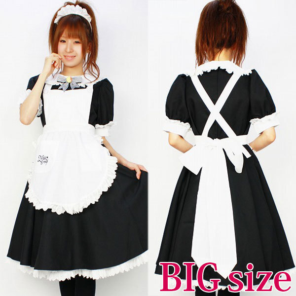 商品番号:cm0151 カラー:-- 種類:コスチューム/NH1004B 仕様:BIGサイズ:B92〜100cm・W78〜84cm 丈:ワンピース108cm(袖丈30cm)・ペチコート67cm セット内容:ワンピース(後ろファスナー、袖パフスリーブ、袖、襟繰りにレース付)・エプロン(肩紐下部にボタン付、ポケット付)・ペチコート(裾レース付、ウェストゴム仕様)・カチューシャ(全フリル)・ブローチ(安全ピン付)・メイドキャップ(クリップ付)