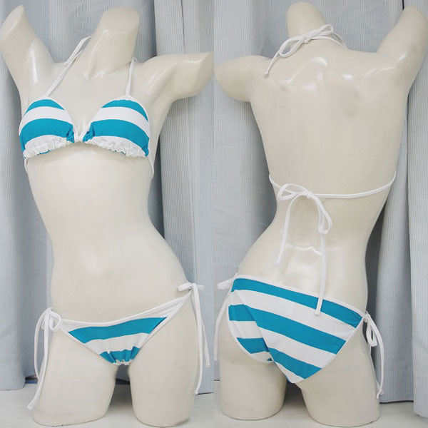 商品番号:cm0377 カラー:ターコイズ・ホワイト 種類:コスチューム/NH5034F 仕様:フリーサイズ:Bアンダー〜80cm・Bトップ〜100cm・W(ショーツ)60〜76cm 丈:肩紐各50cm(ホルターネック)・ショーツ紐38〜40cm セット内容:ビキニブラ(ブラパット付、パットケースあり)・紐ビキニショーツ