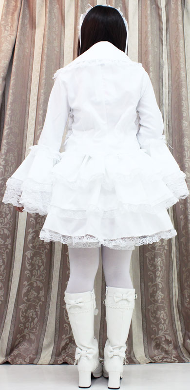 商品番号:cm0462 カラー:ホワイト 種類:コスチューム/NH1016M 仕様:Mサイズ:B〜92cm・W63〜110cm 丈:上着48cm(袖丈63cm・肩幅38cm)・付け襟(首回り)41cm・スカート48cm セット内容:上着(前ボタン)・スカート(ウエスト部分ゴム、スカート3枚仕立て、裏地付き、チュールパニエ付き)・付け衿(ボタンにて着脱可)・ヘッドドレス