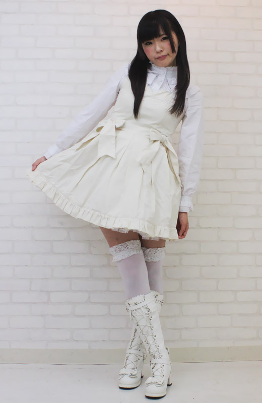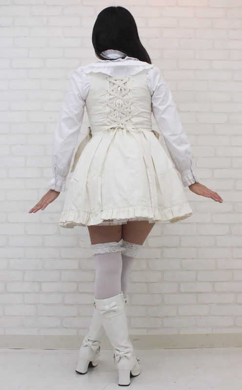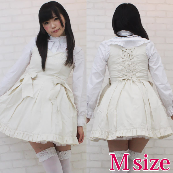 商品番号:cm0593 カラー:オフホワイト 種類:コスチューム/NK1007M 仕様:Mサイズ:B78〜86cm・W62〜74cm 丈:ジャンパースカート76cm・ブラウス49cm(肩幅36cm、袖丈61cm、袖口20cm) セット内容:ジャンパースカート(横ファスナー、後ろ編み上げシャーリング、パニエ内蔵)・ブラウス(前ボタン、後ろ編み上げシャーリング)