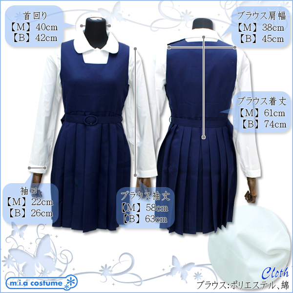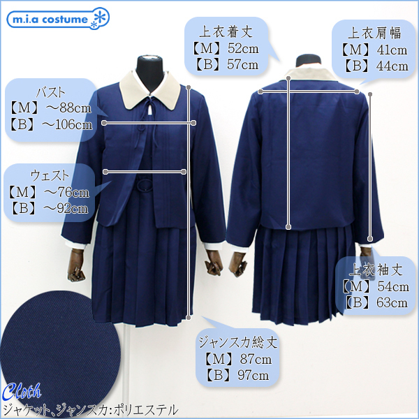 商品番号:cm0639 カラー:-- 種類:コスチューム/NH3078B 仕様:BIGサイズ:B〜106cm・W〜92cm ブラウス(着丈74cm・肩幅45cm・袖丈63cm・袖口26cm・首回り42cm) ジャケット(着丈57cm・肩幅44cm・袖丈63cm) ジャンパースカート(総丈97cm) セット内容:ジャケット、丸襟ブラウス、ジャンパースカート、ベルト
