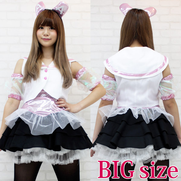 商品番号:cm0714 カラー:ピンク 種類:コスプレ衣装/NH2059B 仕様:BIGサイズ:B88〜97cm・W68〜82cm 丈:上衣44cm(肩紐34cm)・インナー前身頃丈:45cm・スカート38cm・パニエ40cm・アームカバー(腕囲)約38cm セット内容:上衣(前ボタン)・インナー(サイドファスナー)・スカート(ボタン留め、一部ゴム入り)・パニエ・アームカバー・カチューシャ