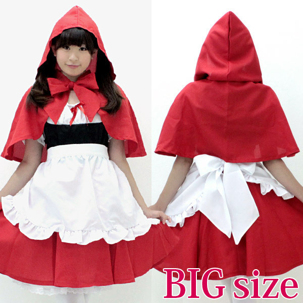 商品番号:cm0867 カラー:-- 種類:コスチューム/NY2005B 仕様:BIGサイズ:B〜105cm・W〜83cm 着丈:82cm・袖丈28cm・肩幅40cm フード付きケープ:着丈(首から下)36cm・(首から上)40cm・首周り(リボン付け根まで)56cm セット内容:ワンピース(後ろファスナー)、頭巾(フード付きケープ)、エプロン