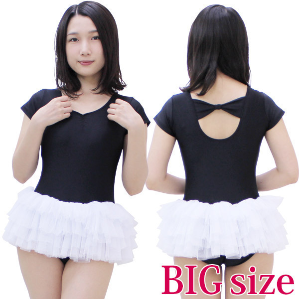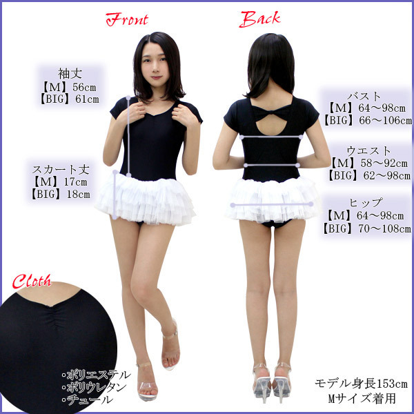 商品番号:cm1058 カラー:黒×白 種類:コスチューム/HB6005B 仕様:BIGサイズ:B66〜106cm・W62〜98cm・H70〜108cm・着丈57cm・袖丈11.5cm・スカート丈18cm セット内容:レオタード単品(一部当て布付き) 素材:ポリエステル、ポリウレタン、チュール