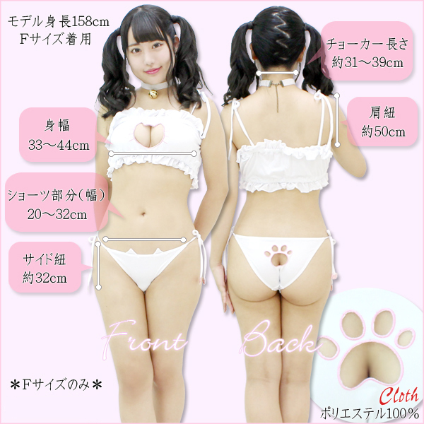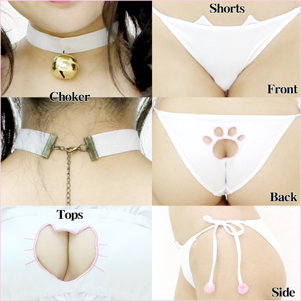 商品番号:cm1127 カラー:ホワイト 種類:コスチューム/NH6001 仕様:フリーサイズ 上衣:身幅33〜44cm・肩紐約50cm ショーツ:幅20〜32cm・サイド紐約32cm チョーカー:約31〜39cm(チェーン部分含む) セット内容:上衣ブラ(パッドなし)、紐ショーツ(クロッチ有り)、首輪チョーカー 素材:ポリエステル100%
