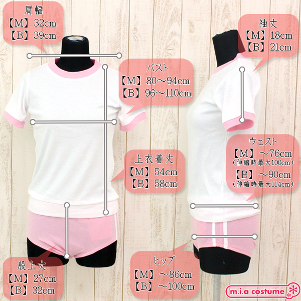 商品番号:cm1130 カラー:ピンク 種類:コスチューム/NH3084B 仕様:BIGサイズ B96〜110cm・W〜90cm(伸縮時最大114cm)・H〜100cm 上衣:着丈58cm・肩幅39cm・袖丈21cm ブルマ:股上丈32cm セット内容:上衣、ブルマ 素材:ポリエステル65%、コットン35%