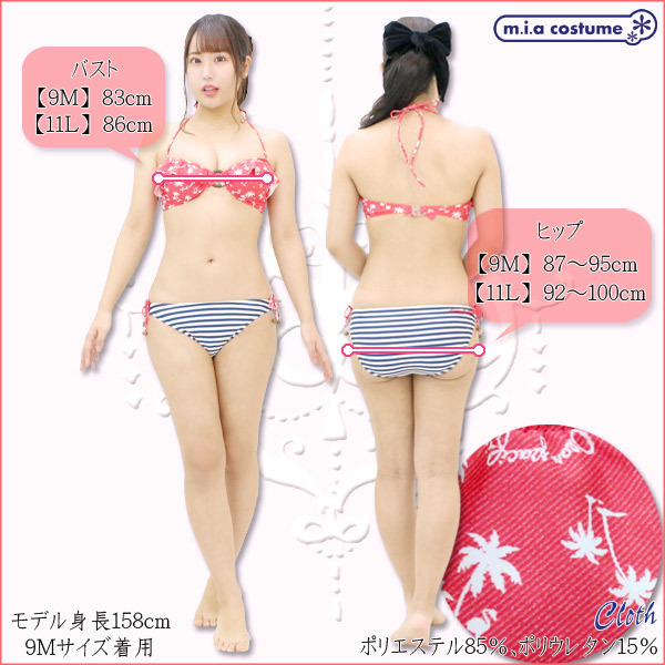 商品番号:cm1158 カラー:レッド 種類:コスチューム/H134−9M 仕様:9Mサイズ:B83cm・H87〜95cm セット内容:トップス(パッド着脱可、ワイヤー無し)、ビキニショーツ 素材:ポリエステル85%、ポリウレタン15% 生産国:日本