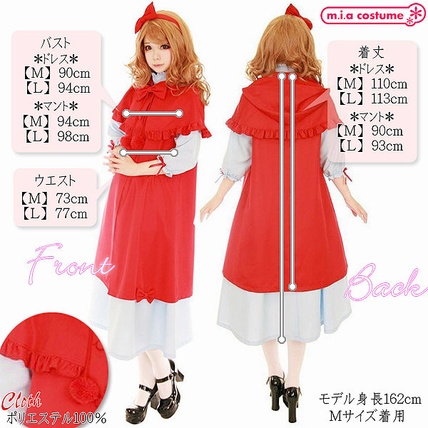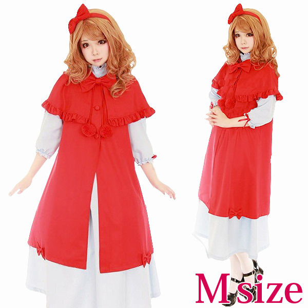 商品番号:cm1165 カラー:-- 種類:コスチューム/z063−M 仕様:Mサイズ:ドレス(B90cm・W73cm・着丈110cm)・マント(B94cm・着丈90cm) セット内容:ドレス(後ろファスナー)、マント(前ボタン)、カチューシャ(ブローチピン付き)、ボンボン付きリボン 素材:ポリエステル100%