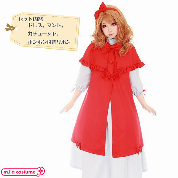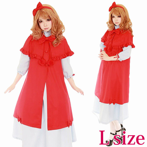 商品番号:cm1166 カラー:-- 種類:コスチューム/z063−L 仕様:Mサイズ:ドレス(B94cm・W77cm・着丈113cm)・マント(B98cm・着丈93cm) セット内容:ドレス(後ろファスナー)、マント(前ボタン)、カチューシャ(ブローチピン付き)、ボンボン付きリボン 素材:ポリエステル100%