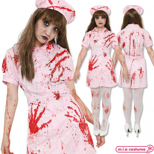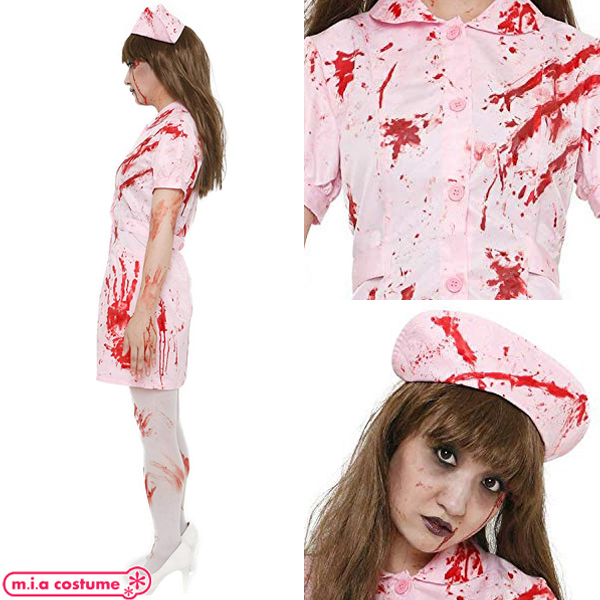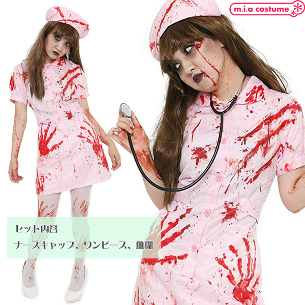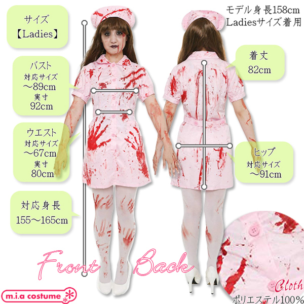 商品番号:cm1202 カラー:ピンク 種類:コスチューム/CL863694 仕様:Ladiesサイズ:B〜89cm・W〜67cm・H〜91cm・身長155〜165cm・着丈82cm セット内容:ナースキャップ、ワンピース(前ボタン)、血糊 素材:ポリエステル100%