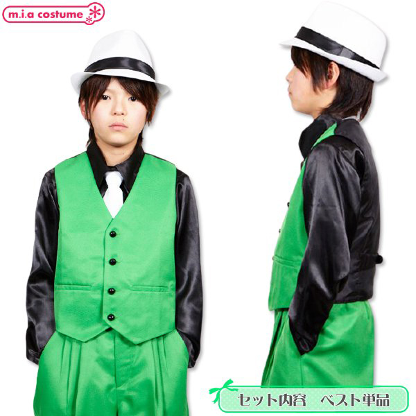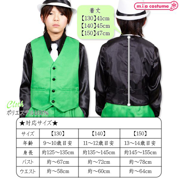 商品番号:cm1261 カラー:グリーン 種類:コスチューム/CL848714 130サイズ 仕様:130サイズ 対応サイズ:身長125〜135cm・B〜67cm・W〜58cm 実寸:着丈41cm セット内容:ベスト単品(前ボタン) 素材:ポリエステル100%