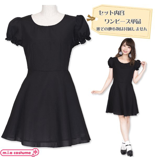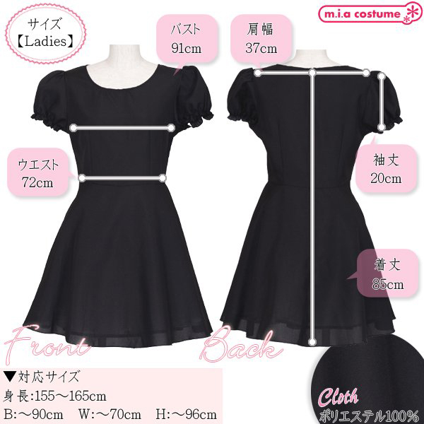 商品番号:cm1271 カラー:ブラック 種類:コスチューム/CL052879 仕様:対応サイズ:身長155〜165cm・B〜90cm・W〜70cm・H〜96cm 実寸:B91cm・W72cm・肩幅37cm・袖丈20cm・着丈85cm セット内容:ワンピース単品(背中心ファスナー) 素材:ポリエステル100% モデル身長155cm