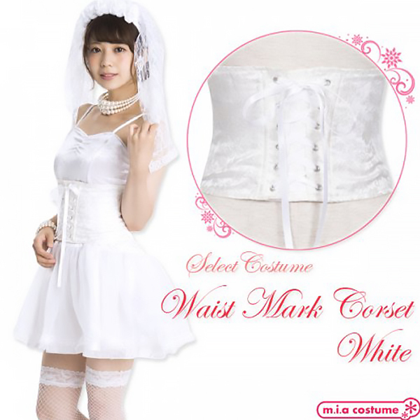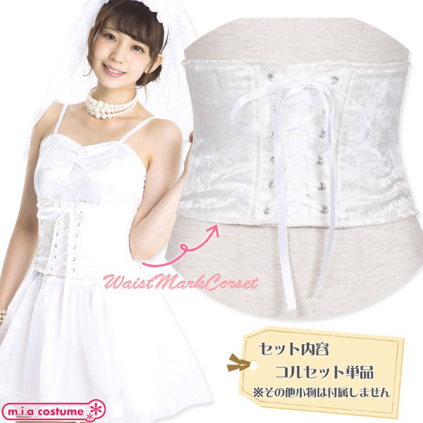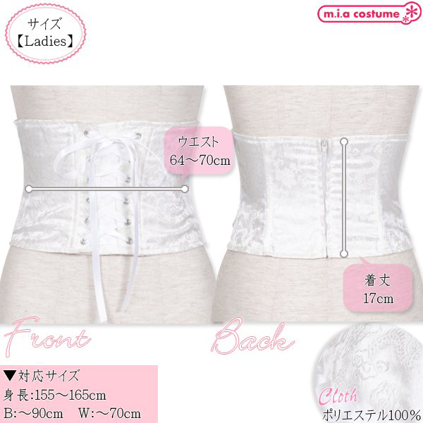 商品番号:cm1280 カラー:ホワイト 種類:コスチューム/CL053036 仕様:対応サイズ:身長155〜165cm・B〜90cm・W〜70cm 実寸:W64〜70cm・着丈17cm セット内容:コルセット単品(背中心ファスナー) 素材:ポリエステル100% モデル身長155cm