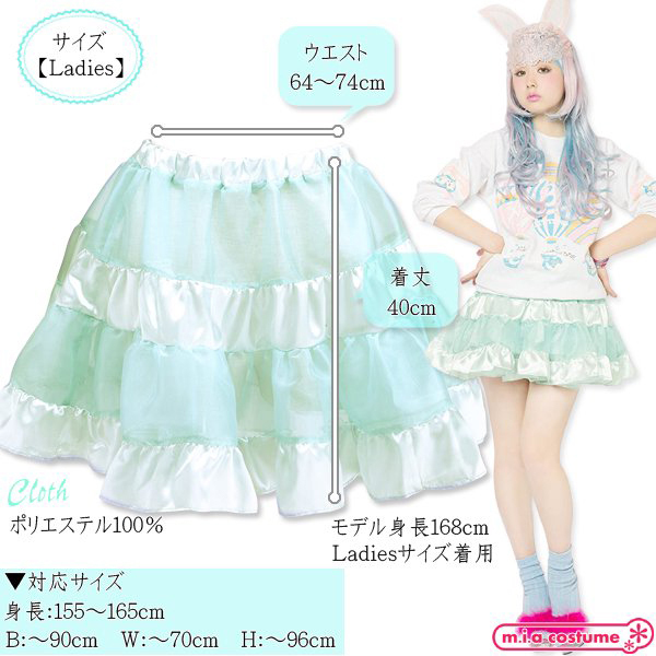 商品番号:cm1301 カラー:ベビーブルー 種類:コスチューム/CL852421 仕様:対応サイズ:身長155〜165cm・B〜90cm・W〜70cm・H〜96cm 実寸:W64〜74cm・着丈40cm セット内容:スカート単品(ウエストゴム) 素材:ポリエステル100% モデル身長168cm