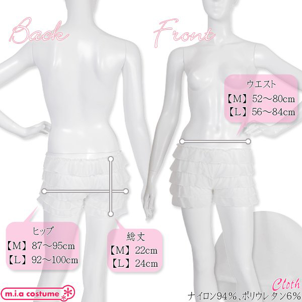 商品番号:cm1328 カラー:ホワイト 種類:コスチューム/CL869368 仕様:Lサイズ W56〜84cm・H92〜100cm・総丈24cm セット内容:ペチコートパンツ単品(ウエストゴム) 素材:ナイロン94%、ポリウレタン6% モデル身長162cm