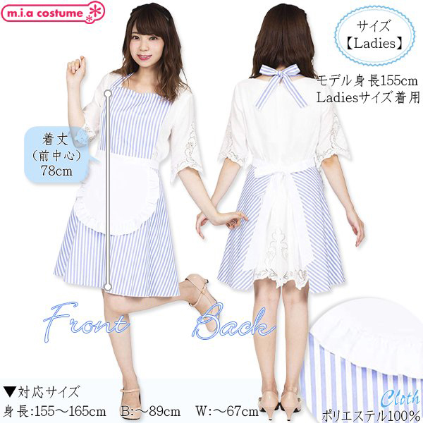 商品番号:cm1339 カラー:ブルー 種類:コスチューム/CL883586 仕様:対応サイズ:身長155〜165cm・B〜89cm・W〜67cm 実寸:着丈78cm(前中心) セット内容:エプロン単品(首リボン、腰リボン) 素材:ポリエステル100%