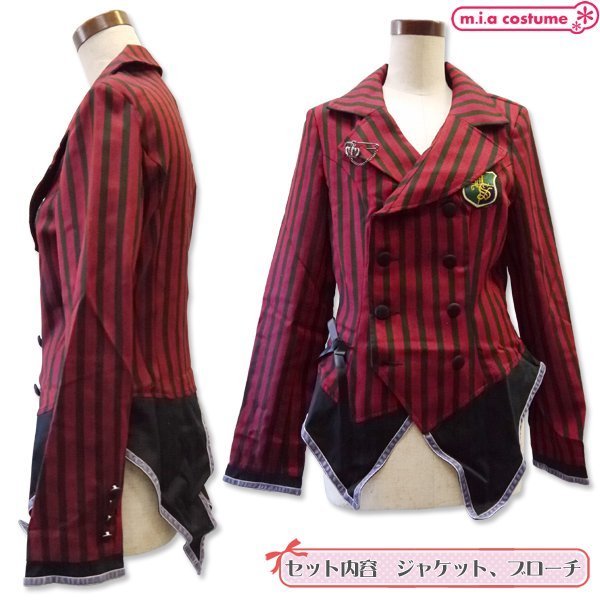 商品番号:cm1346 カラー:レッド 種類:コスチューム/p288−red−m 仕様:Mサイズ:B90cm・W76cm・肩幅37cm・袖丈58cm・着丈48〜77cm セット内容:ワッペン付きジャケット(前ボタン)、ブローチ 素材:ポリエステル、その他