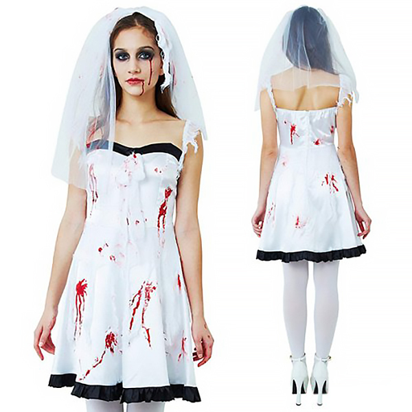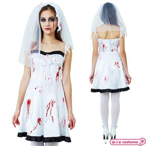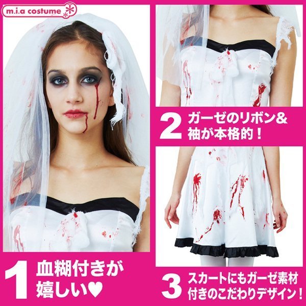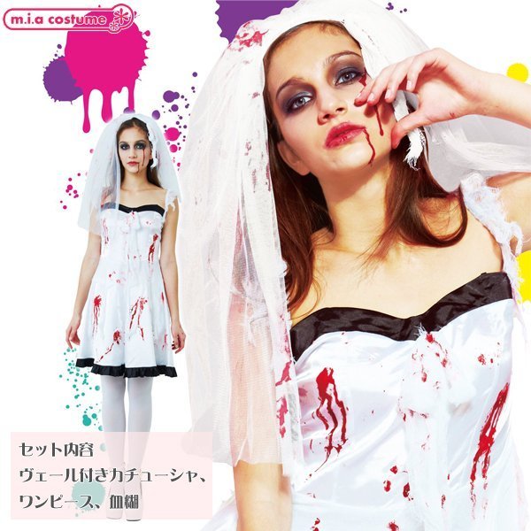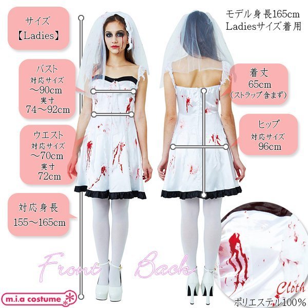 商品番号:cm1353 カラー:ホワイト×ブラック 種類:コスチューム/CL841531 仕様:フリーサイズ:身長155〜165cm・B74〜92cm・W72cm・着丈65cm(ストラップ含まず) セット内容:ヴェール付きカチューシャ、ワンピース(裏地無し、背中心ファスナー)、血糊 素材:ポリエステル100%